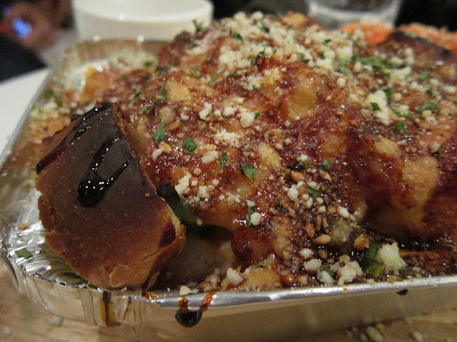 The scallop pot pie 'roll' was the biggest surprise of the night in that it wasn't really a roll at all. While the menu described it as "butter phyllo cup with creamy scallop, white sauce and melted mozzarella on top of a signature california roll" it arrived looking like a seafood casserole of sorts. I guess the tip-off should have been when our server told us there would be a longer wait time because it needed to go in the oven. We couldn't seem to find the "california roll" beneath all the creamy scallop-pie mixture going on, although we'd randomly hit spots of crab and rice.